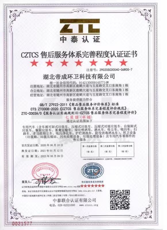 湖北帝成環衛科技有限公司售后部組織相關部門進行評審鎖定故障及安全事故原因,判定責任方,第一時間解決客戶損失。如問題原因由供應商質量問題導致,追訴供應商責任,并責成供應商對所有涉及車輛進行更換維修,保證產品質量,承擔客戶損失。并對此類故障提供分析報告,橫縱向展開排查同批次或同類型產品質量,確保出廠零部件滿足車輛適用要求。